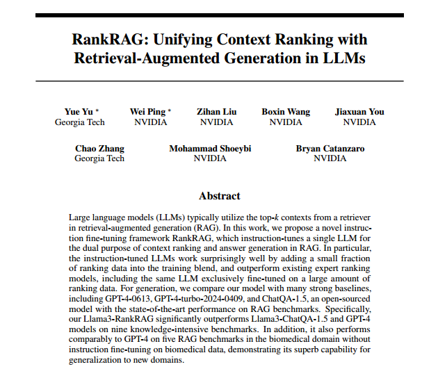 本篇文章提出了一个新的指令微调框架RankRAG,该框架通过指令微调单个大型语言模型,使其同时具备上下文排序和答案生成的能力,从而提升检索增强生成任务的效率。文章在多个数据集进行了广泛测试,结果表明在多种任务上RankRAG相较于其他基线模型,展现出了更为卓越的性能表现。RankRAG框架