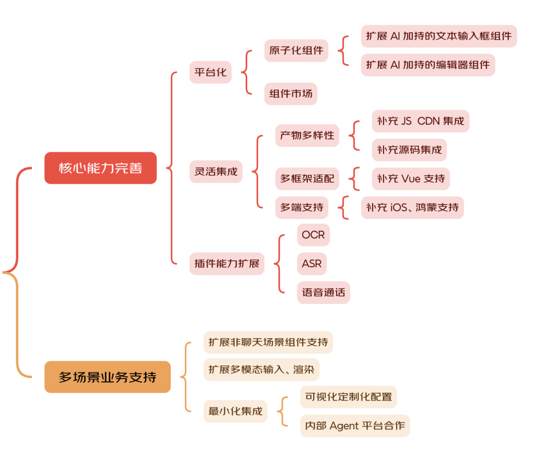 在接下来的时间里,我们将在以下 2 个方面加大对 AIGCDesign 的投入:•平台能力建设:支持高度灵活的配置化能力,提供便捷的组件产出和搭建能力。•多端多框架能力建设:提供 NPM/UMD 等多种形式产物,输出多端容器和组件,实现技术栈无关的接入能力。•底层能力扩充:逐步融合 OCR、ASR/TTS、Agent、知识库等多种底层能力。2、2B端/2C端多业务形态支持,多场景交互形式拓展•场景化能力扩展:支持 B/C 端通用的场景化AI交互能力和组件,极低成本快速接入。•通用能力支持:结合 AI 能力,拓展非对话框场景交互能力。提供高度可配置化交互组件,支持数据源配置和交互定制化,配合投放平台,满足营销、办公等各类场景。 相信在京东零售前端通道内源共建小组的努力、内外部贡献者的协同建设以及京东丰富业务场景的加持下,AIGCDesign 一定能够交付更多优秀的能力和组件,为研发提效和业务赋能带来更大、更多的价值。- END