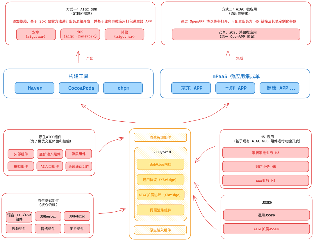 原生实现方面,我们采用基于 JDHybrid 的混合架构:2)对不经常变更的容器组件、基础组件通过原生开发;3)业务侧 Taro 组件,可以快速复用到 Native 项目中。1)原生基础组件:包含弹层、语音交互、Toast 提示、自定义头部、底部输入框、工具箱等等组件。2)原生容器组件:负责整体事件、UI、接口请求等等配置,是 AIGC 组件的核心模块。3)JDHybrid 扩展协议和 AIGC JSSDK:负责 H5 和原生容器组件交互和消息通信。
