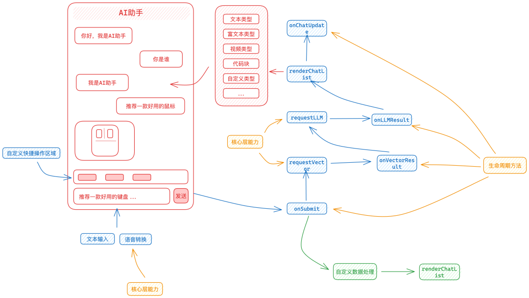 •onSubmit:用户点击发送按钮后,请求大模型前执行•onLLMResult:大模型数据返回后执行,用于在组件外部获取返回数据•onChatUpdate:组件更新完成后执行,代表本次会话更新完成3.3 用户交互和数据流转流程