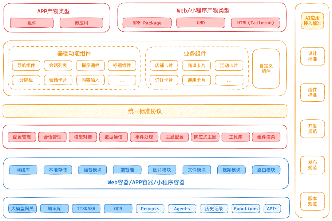 结合以上,我们共识了方案的核心定位和目标,这也是 AIGCDesign 开放式跨端 AI 解决方案的优势所在:开放式跨端 AI 组件解决方案,用于提升 AI 场景下前端研发交付效率。打造一个支持便捷自定义拓展的、跨端的、轻重兼备的 AI 组件解决方案,可以快速接入不同的业务流程和技术框架,并提供UI组件支持多场景展示。根据核心目标,确认技术选型、技术架构和技术实现细节。3.1 整体技术架构