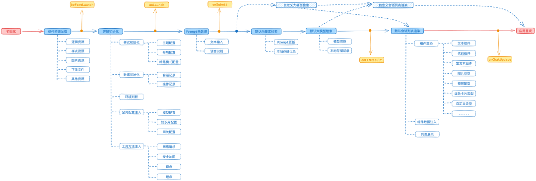 容器组件提供应用生命周期方法,开发者可在每一个流程节点进行事件监听并获取最新应用状态,同时结合生命周期函数和容器属性,可进行定制化逻辑开发,灵活支持各类业务形态,生命周期主要特性有:•容器组件提供全流程生命周期事件,调用方可随时获取应用最新上下文和数据•默认提供京东言犀平台对接模块,使用基础配置即可解锁完整的AI会话交互基础流程•通过容器组件属性配置,灵活添加自定义流程控制:模型检索、会话渲染、生命周期等