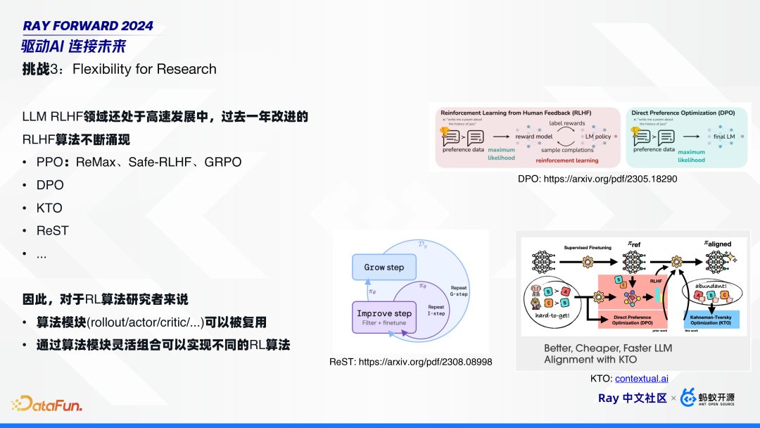 由于 LLM RLHF 领域还处于高速发展中,过去一年涌现了非常多的新算法,包括 PPO 算法的一些变种,比如 ReMax、Safe-RLHF、GRPO;还有针对 PPO 的改进,比如 DPO、KTO、ReST 等。其中,DPO 将 RLHF 简化成两个模型;KTO 更进一步,不需要有 pair 对;Google 提出的 Rest,进行模型自学习,而不需要外部奖励模型。