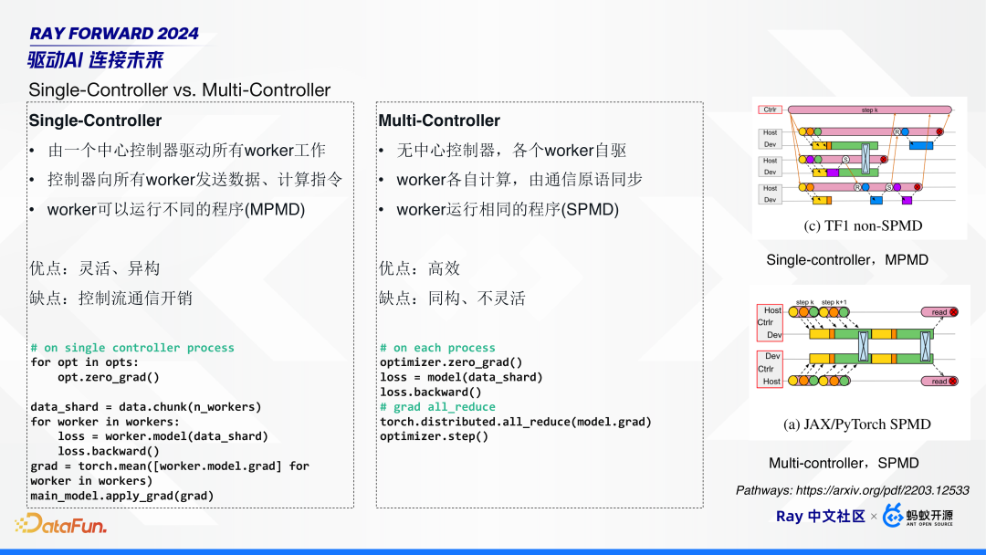 在分布式系统中采用 Single-Controller 还是 Multi-Controller 是个重要命题。Google Pathways 在论文中对这两点做了非常详细的阐述。