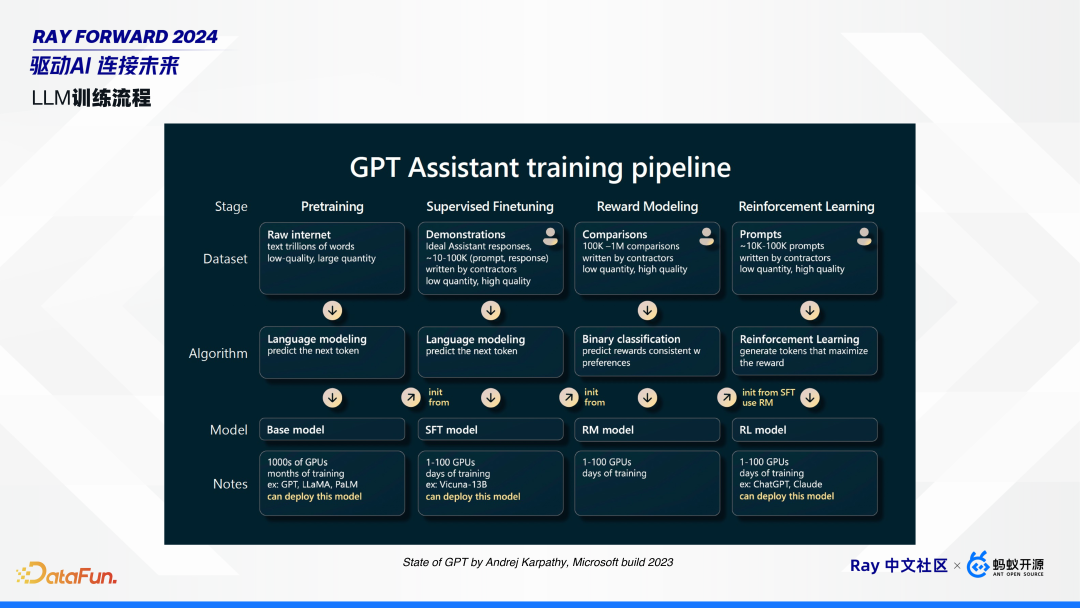 借用 Andrej Karpathy 在 Microsoft build 2023 上的大语言模型训练的图。