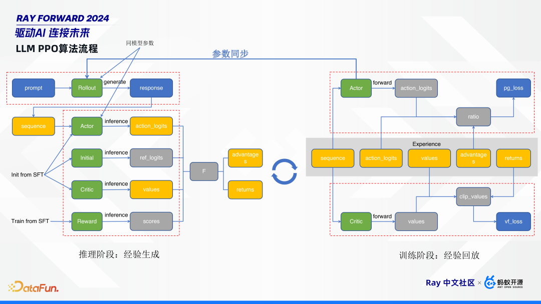 RLHF 算法整体比较复杂:多阶段,有推理有训练;多模型,有 5 个模型,甚至可能更多;框架中需要重点关注 actor 模型,它与 rollout 模型同参数,在训练完成后,要做参数同步,更新给推理阶段的 rollout 模型。