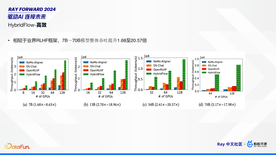 实验结果表明,相比业界其他 RLHF 框架(Deepspeed-Chat、OpenRLHF、Nemo-Aligner),HybridFlow 在 7B 到 70B,模型吞吐量提高了 1.6 倍到 20 倍不等。