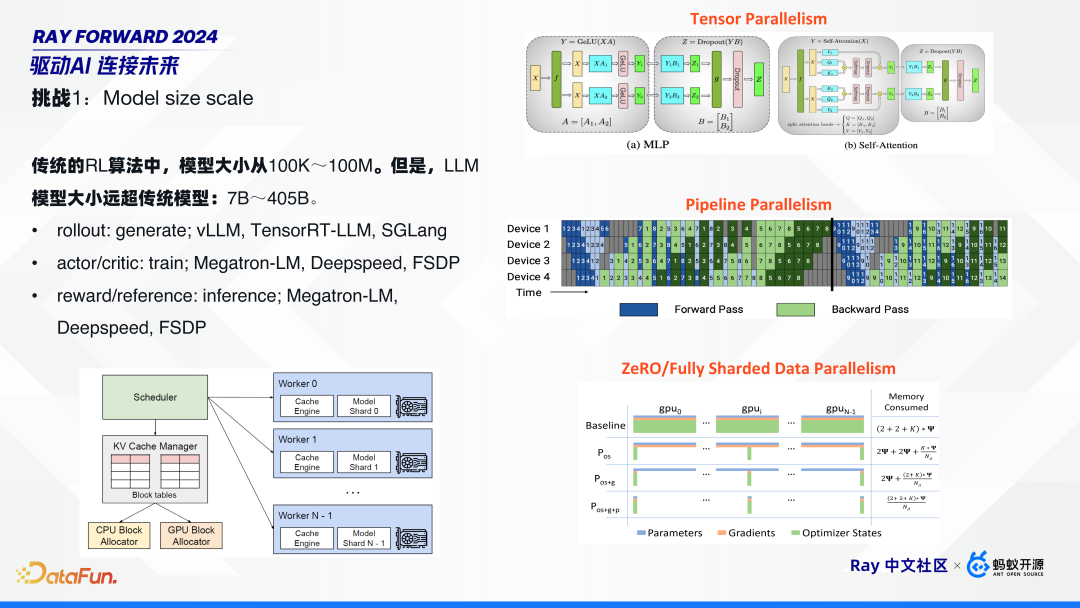 模型规模变大是最直观的一个挑战。传统的 RL 算法中,模型大小从 100K~100M。但是,LLM 模型大小远超传统模型:7B~405B。在这么大的模型规模下,对每一个计算点,都需要单独针对性地做优化。比如: