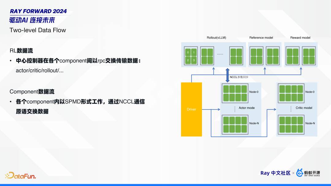 第二部分是组件内部的数据流。每个组件都是分布式的,组件内部是 SPMD 的工作模式,通过 NCCL 进行数据交换。