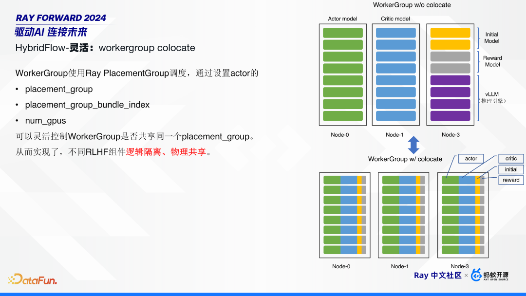 WorkerGroup 可以进行灵活组合,使用 Ray PlacementGroup 调度,通过设置 actor 的 placement_group、GPU 数量等,灵活控制 WorkerGroup 是否共享同一个 placement_group, 从而实现了不同 RLHF 组件逻辑隔离、物理共享,提高了资源利用率。