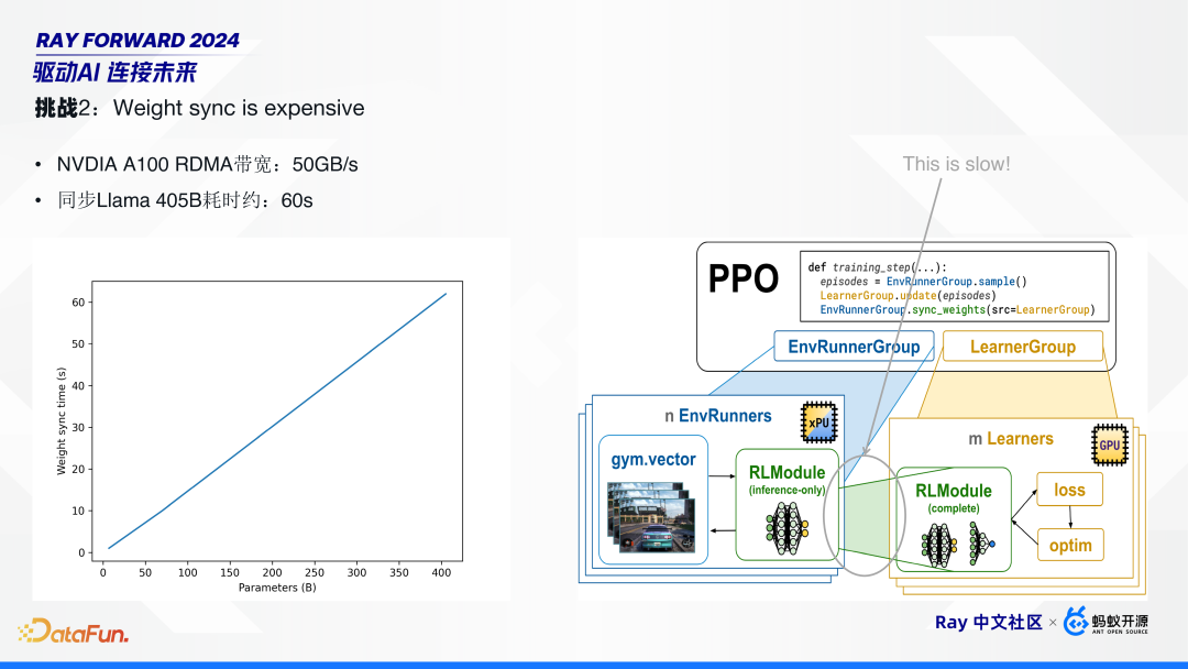 随着模型规模增大,模型参数的同步变得更加耗时。比如,英伟达 A100 显卡的跨机器的 RDMA 带宽可达 50GB/s,它同步一个 Llama 405B 耗时仍需 60 秒左右。这在 PPO 算法中,占比较高。在传统模型中,这个同步耗时可以忽略不计,但在大语言模型中,需要针对性优化。