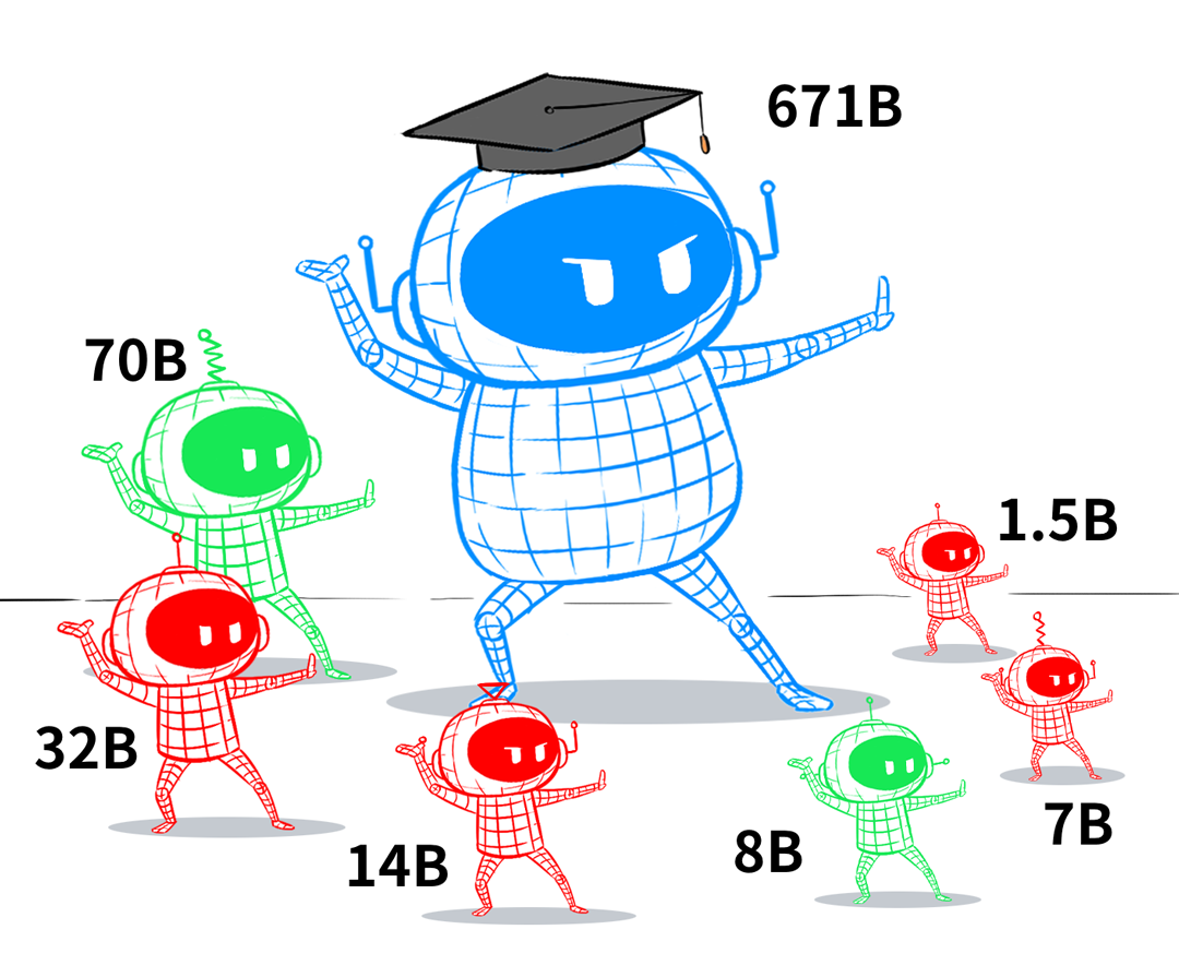 看,前几天让大家本地安装的那些模型,其实就是从DeepSeek R1这个老师蒸馏得到的,每个学生都从老师身上学到了些“三脚猫”功夫。