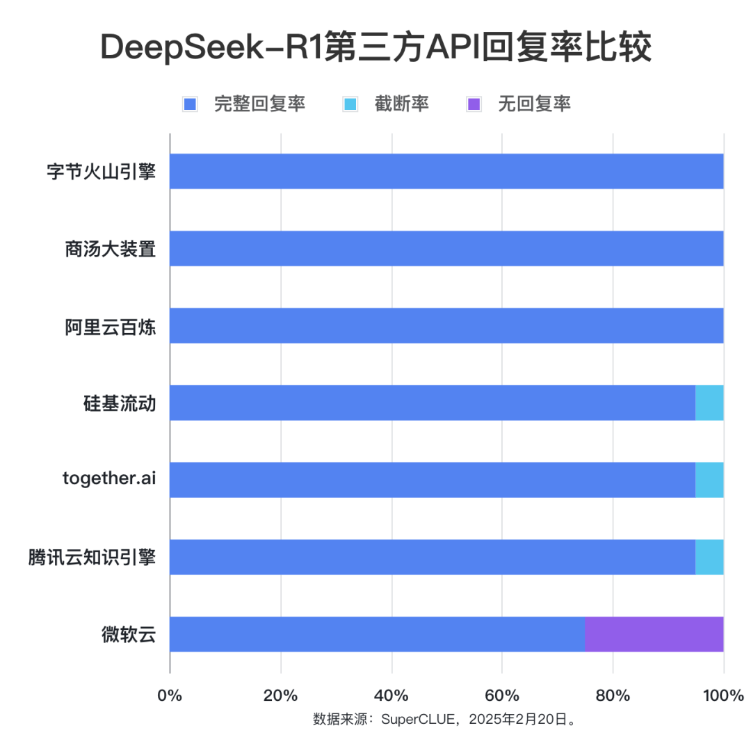 测评要点1:各个第三方平台使用DeepSeek-R1的完整回复率表现差异不大