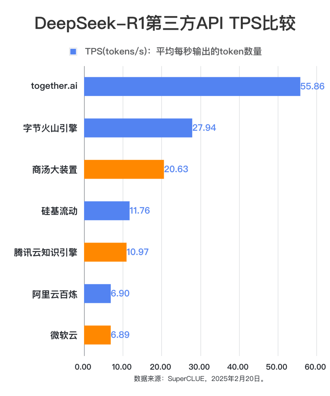除微软云的DeepSeek-R1 API外,其他的完整回复率都在95%以上。火山引擎、商汤大装置、阿里云百炼都实现了100%的完整回复率。测评要点2:各第三方API接口输出效率差距明显,平均每秒输出token数量最低6.9个,最高55.86个。
