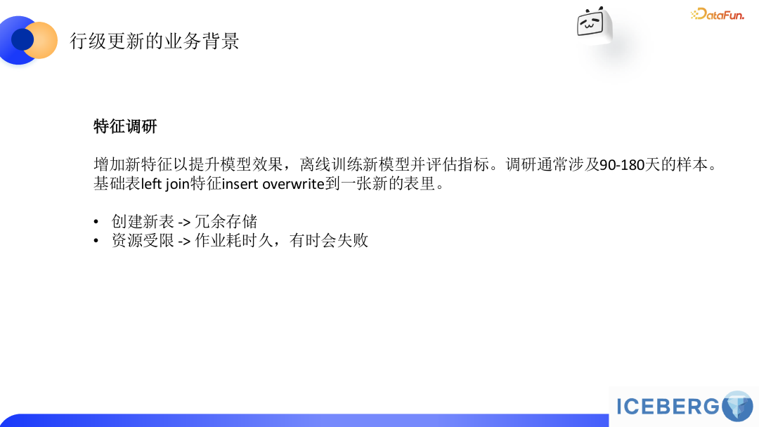 导读 本次分享重点讲解了 Iceberg 的业务应用,涵盖特征调研、更新场景支持及性能兼顾等实际应用,包括在 branch 上支持独立 schema 的实现,优化特征调研流程;通过 ColumnFile 实现灵活高效的更新场景;以及宽表治理与数据回刷方案,显著提升了数据管理和使用的灵活性,为复杂业务需求提供了高效解决方案。