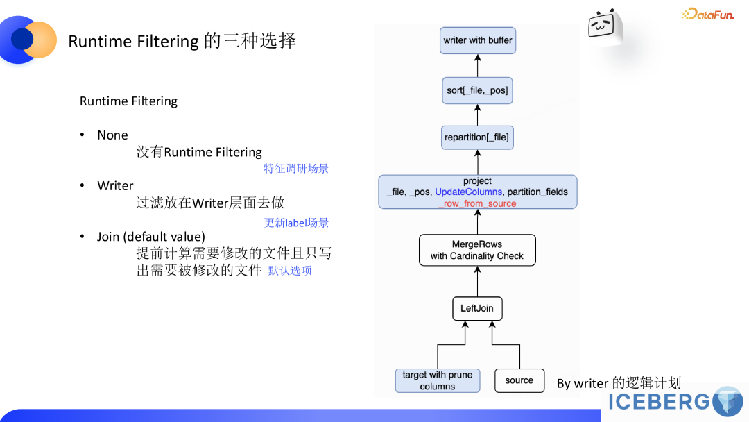 从执行计划看,数据处理涉及两次 Join,其中第一次 Join 用于筛选需要更新的文件。这一步的主要目的是通过 Runtime Filtering 确定更新文件路径集合(类似倒排索引)。然而,如果业务场景中 99% 的数据都需要更新,则首次 Join 的必要性大幅降低。例如,在特征调研场景下,几乎每一行数据通常都需要变更,这意味着 Runtime Filtering 的 selectivity 非常低。因此,可以尝试直接跳过首次 Join,将 Runtime Filtering 设置为 None(全表扫描)。这和在关系型数据库里 B+树索引没有什么过滤效果反而直接建议全表扫描是本质是一回事。在这种优化下,处理流程默认所有文件都需要被更新,写入的时间也随之大幅缩短。这种方法在某些特定场景中效果显著,尤其是特征调研场景。将处理时长从原来的三个小时减少到十几分钟。 值得注意的是,Iceberg 在原生的行级更新的论文里 VLDB - Petabyte-Scale Row-Level Operations in Data Lakehouses 针对Runtime Filtering 只做了 high selectivity 场景的测试,并没有给出 low selectivity 场景下的性能报告,而 low selectivity 的场景是业务应用很重要的一块,尤其是针对我们的特征调研场景。在该场景下,Runtime Selectivity 几乎为 0。Runtime Filtering 反而起到了副作用。
