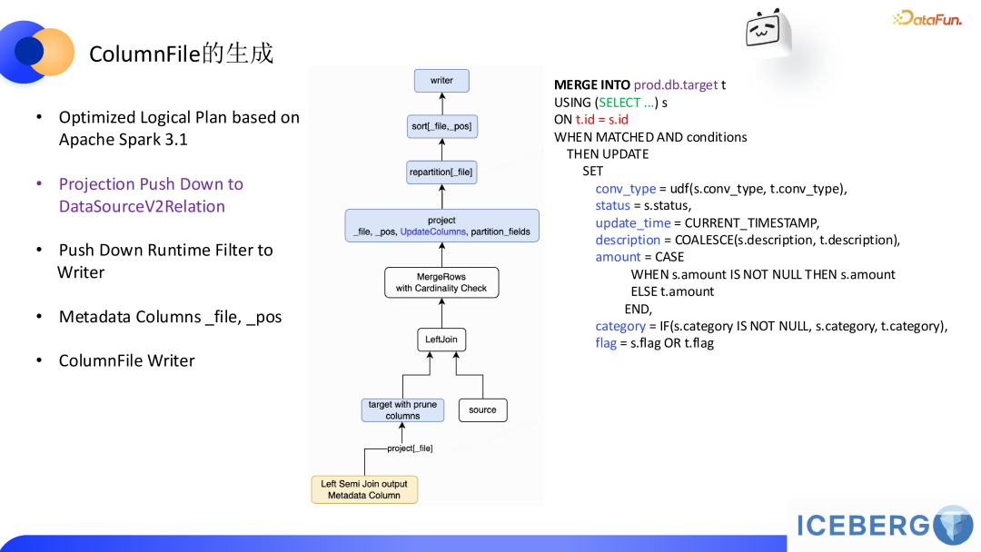 ColumnFile 的生成是整个流程的核心,以下是具体过程的说明:上图 SQL 示例中,更新的字段包括 conv_type、status、update_time 等,最终这些字段会被写入到 ColumnFile 中,该 SQL 最终 spark 执行的时候会产生 ColumnFile。SQL 里面只有一次 join,为什么执行计划里面会出现 2 次 join 的节点 ?这里第一次 Join 是筛选出需要更新的文件路径(注意: 我们期望该 runtime filter 具备 high selectivity,后面会针对这里做进一步优化),第二次 Join 参与的 target 表利用第一次 join 得出的文件路径来过滤不需要的文件以减少需要处理的数据量。完成 Join 后,数据会按照以下流程进一步处理: