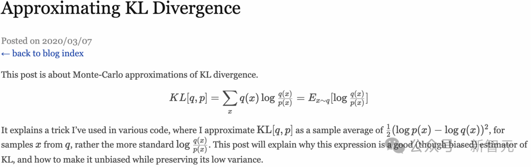 DeepSeek-Math论文第14页:在损失函数中添加KL散度,正则化GRPO算法同样,John Schulman的博客也提到,反向KL项的无偏估计,实际上并不需要额外的q项。