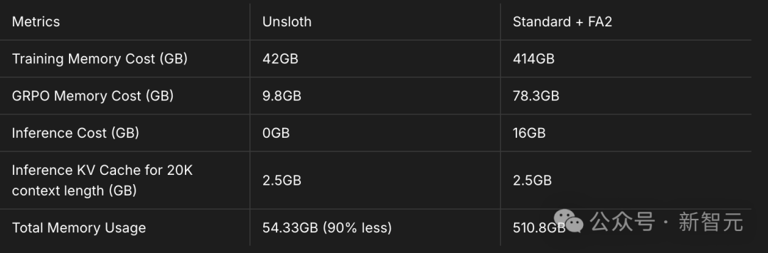 在20K的上下文长度下,每个提示生成8次,Unsloth在Llama-3.1-8B模型上仅使用54.3GB的VRAM,而标准实现需要510.8GB(Unsloth减少了90%)。这一切得益于下列3项突破:- 全新设计的内存高效线性算法:将GRPO的内存使用量削减了8倍以上,节省了68.5GB的内存。借助torch.compile,在num_generations=8和20K上下文长度下,实际上还更快。