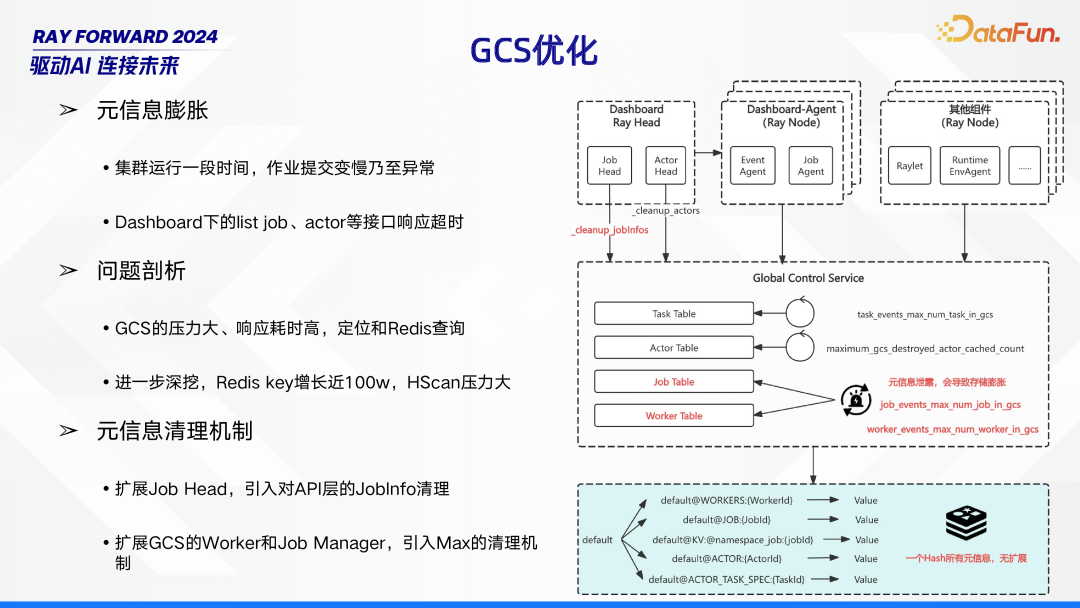 GCS(全局控制服务)优化成为亟待解决的问题,主要源于元信息膨胀现象。当集群运行一段时间后,作业提交速度明显变慢,甚至出现异常情况,同时 Dashboard 下的 list job、actor 等接口也会响应超时。