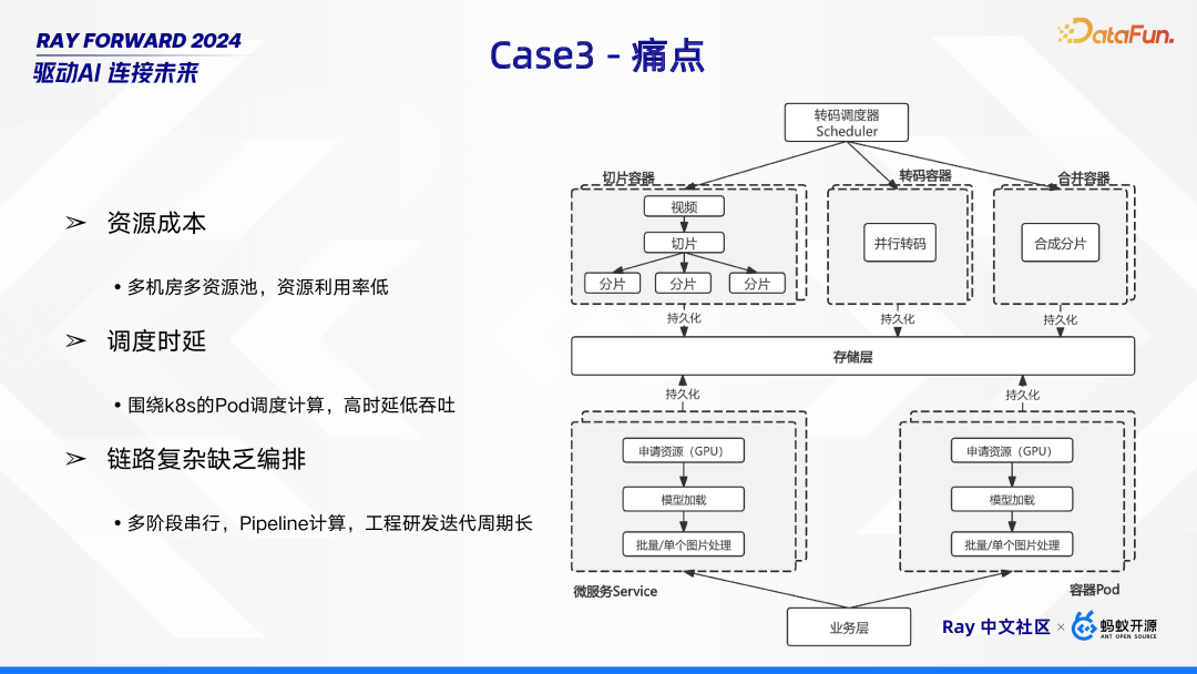 - 目前采用下发任务到 K8s 的方式,针对不同计算匹配不同资源类型。然而,这一过程中资源利用率较低,主要原因在于 Pod 调度、资源加载以及模型初始化等环节,这些环节消耗了大量时间与资源,影响了整体的 GPU 计算效率。