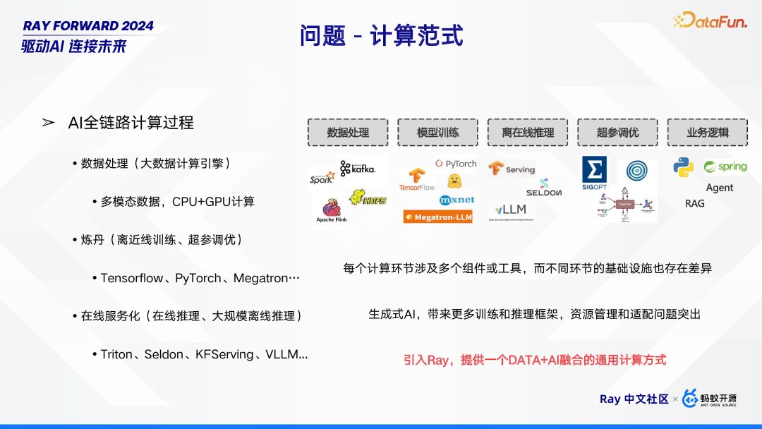 在计算范式中,AI 全链路计算过程涵盖多个关键环节。数据处理环节借助大数据计算引擎,针对多模态数据进行 CPU 与 GPU 协同计算;“炼丹” 环节包括离线和近线训练、超参调优,会用到 TensorFlow、PyTorch、Megatron 等工具;在线服务化环节涉及在线推理以及大规模在线推理,常采用 Triton、Seldon、KFServing、VLLM 等。实施方案方面,每个计算环节都涉及众多组件或工具,且不同环节的基础设施存在差异。尤其是生成式 AI 的兴起,带来更多训练和推理框架,使得资源管理和适配问题愈发突出。在此背景下,引入 Ray 可提供一种 DATA 与 AI 融合的通用计算方式,有望解决上述难题。