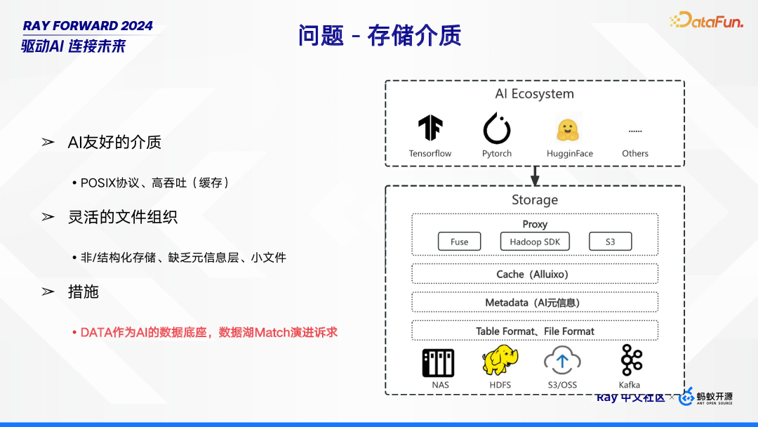 在存储介质方面,AI 对存储有着特定要求。一方面,需要 AI 友好的介质,即遵循 POSIX 协议且具备高吞吐能力(如缓存)的存储介质,以满足 AI 运算对数据读取速度的需求。另一方面,文件组织形式需足够灵活,涵盖非结构化与结构化存储。然而,现有存储常缺乏元信息层,且存在小文件问题。针对这些情况,可采取的措施是,将 DATA 作为 AI 的数据底座,使其能像数据湖一样,匹配不断演进的业务诉求,更好地服务于 AI 应用场景。