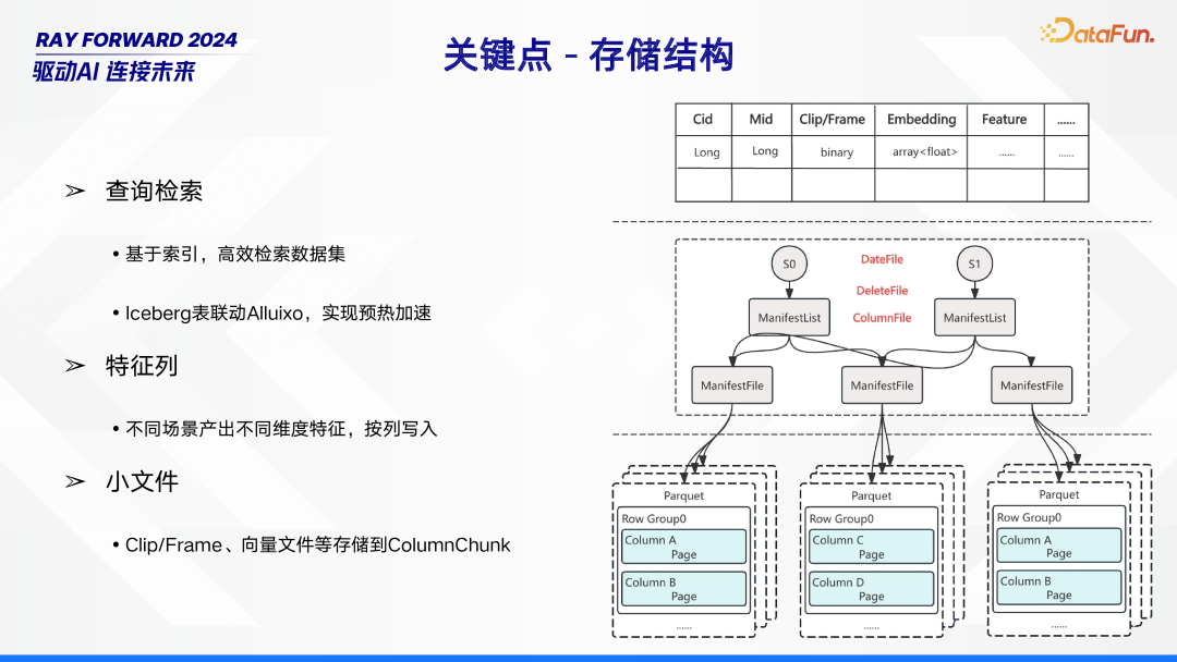 下面介绍 Ray 落地过程中,对存储结构、任务并行、Batch 推理关键点的处理。在存储结构方面,包含多个重要部分。首先是查询检索,通过基于索引的方式实现对数据集的高效检索。同时,借助 Iceberg 表与 Alluxio 的联动,达成预热加速效果,进一步提升检索效率。其次是特征列,依据不同场景,会产出不同维度的特征数据,这些数据将按列写入存储系统。再者是小文件处理,诸如 Clip/Frame、向量文件等小文件,会被存储到 Column Chunk 中,以此优化小文件的存储管理。