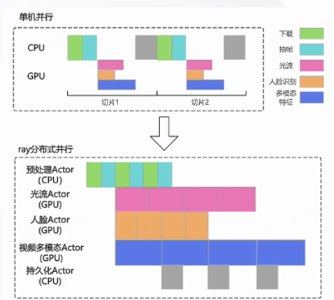 在典型计算范式中,针对多模态计算范式有着特定的处理流程。首先,借助 Iceberg 读取业务相关视频,这些视频的初步处理运行在配备 CPU 资源的 Ray Actor 中,通过读取 SQL 获取特定条件,进而对视频进行视频切片与抽帧操作。在此过程中,目录下的视频文件会进行装箱处理,并且支持断点处理,利用一个大小为 10G 的持久化队列来记录处理进度并保持实时更新。随后,配备 GPU 资源的 Ray Actor 进一步对相关信息(message)进行处理,具体包括对视频切片开展推理、生成 caption,对图片执行 OCR、进行美学评分等操作。之后,执行结果信息会被推送给配备 CPU 资源的 Ray Actor,由其汇总每个视频的标注数据,这些数据涵盖 OCR、评分、caption 等内容,最后将其持久化写入 Iceberg。