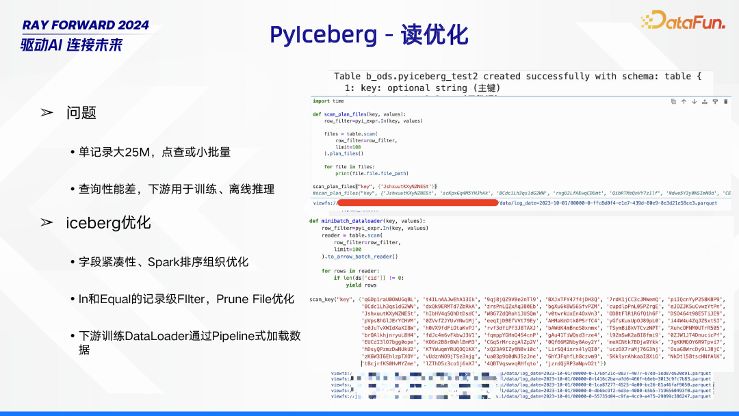 在 PyIceberg 的读操作中存在一些问题。当单条记录大小达到 25M,且执行点查或小批量查询时,查询性能较差,而这些数据下游又常用于训练和离线推理,对性能要求较高。针对这些问题,进行了一系列 Iceberg 优化措施。首先,在数据存储结构上,通过字段紧凑性以及 Spark 排序组织优化,提升数据读取的基础效率;其次,在查询过滤方面,采用 In 和 Equal 的记录级 Filter,结合 Prune File 优化,减少不必要的数据读取;此外,针对下游训练,优化 DataLoader,采用 Pipeline 式加载数据,进一步提升数据读取性能,以满足训练和离线推理对数据读取性能的需求。