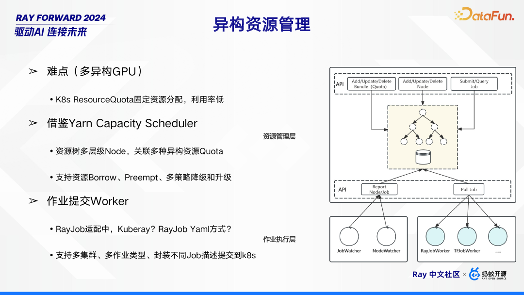 异构资源管理面临诸多挑战,尤其是在多异构 GPU 场景下。其中一大难点在于,K8s 的 ResourceQuota 采用固定资源分配方式,导致资源利用率较低。为解决此问题,可借鉴 Yarn Capacity Scheduler 的策略。通过构建资源树多层级 Node,将其与多种异构资源 Quota 相关联,不仅支持资源的 Borrow(借用)、Preempt(抢占),还具备多策略的降级和升级功能,从而提升资源的动态管理能力。