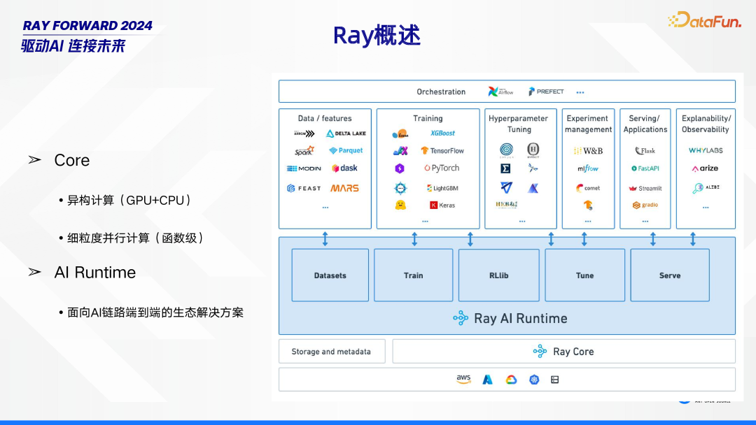 Ray 主要包含 Core 和 AI Runtime 两大部分。在 Core 层面,它具备异构计算能力,能够实现 GPU 与 CPU 的协同工作,同时支持细粒度并行计算,将并行粒度细化到函数级。而 AI Runtime 则是面向 AI 链路,提供从一端到另一端的整套生态解决方案,为 AI 相关任务提供全面支持。