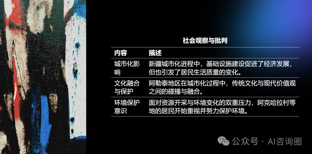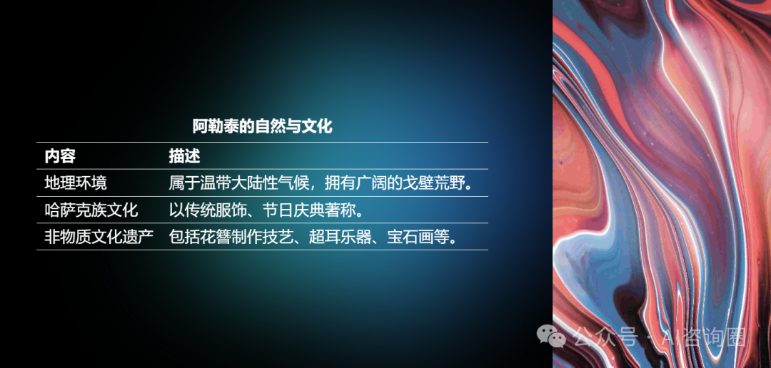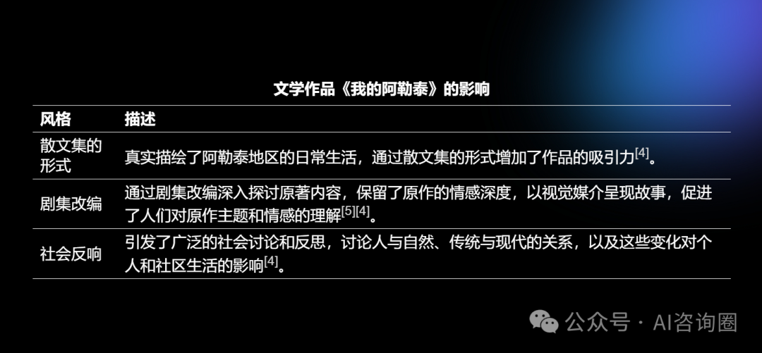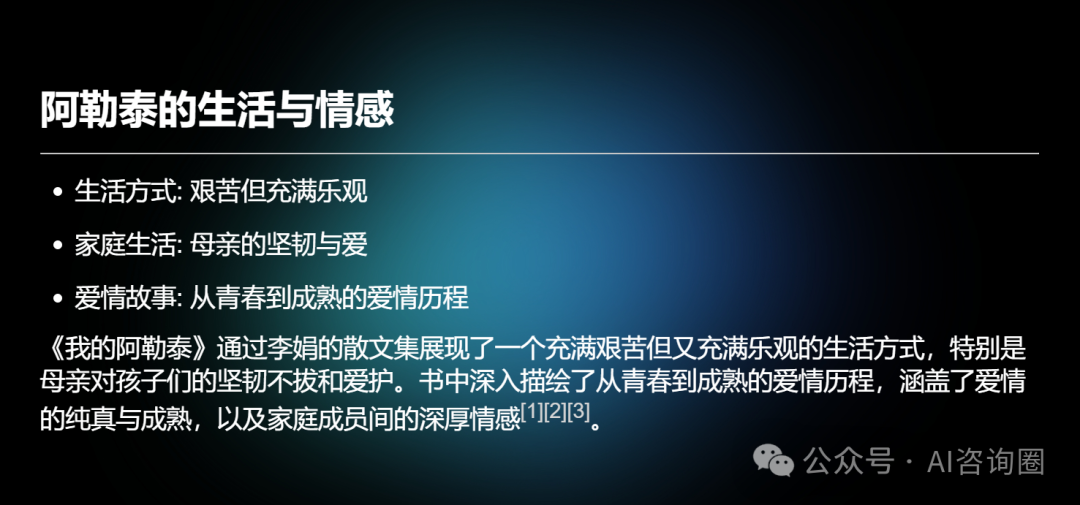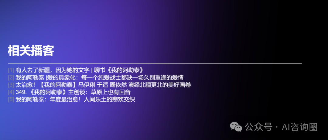 这么多的播客毕竟都是音频内容,当我们需要写书评、影评,或者是相关的主题分享材料时,仍然需要通过文本形式来表现。秘塔AI播客搜索依然可以提供大纲、脑图,以及PPT自动生成的强大支持。大纲先介绍了阿勒泰的自然与文化,然后是阿勒泰的生活与情感,接着分析了我的阿勒泰这部小说及电视剧剧情的相关内容,进一步深入到作者特点的分析,最后延伸到社会观察与批判。个人认为这个大纲结构还是不错的。鼠标放在大纲的二级标题上,会看到数字角标,每个数字角标都链接引用了相关的播客内容,可点击进入相关的音频页面。这一点是我最喜欢秘塔AI之处,他大概是为数不多的不瞎编乱造的AI了。所有的总结、摘取,都是来自于搜索内容为依据,每一处都敢于把原文引用标记出来。一方面能够让用户对AI总结内容有足够的信任,另一方面这个功能也非常实用,查看原文,内容细化整理都很有效。最后,秘塔AI还可以一键根据大纲生成PPT。论PPT制作的专业水准还有些差距,和专业PPTAI生成工具也差一些。不过对于不太复杂的分享交流材料,也还是可用的,毕竟不需要再切换工具。