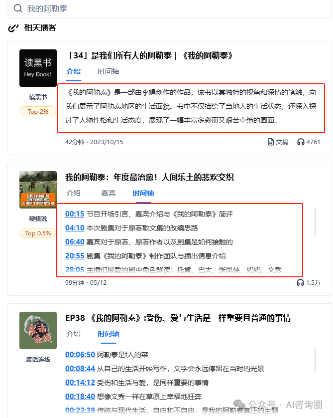 他能够一次性给出30个播客链接的内容概述、时间轴,涉及到嘉宾对话的,还会整理嘉宾信息。比如读黑书的《是我们所有人的阿尔泰》,“介绍”对这部小说的内容做了概括。