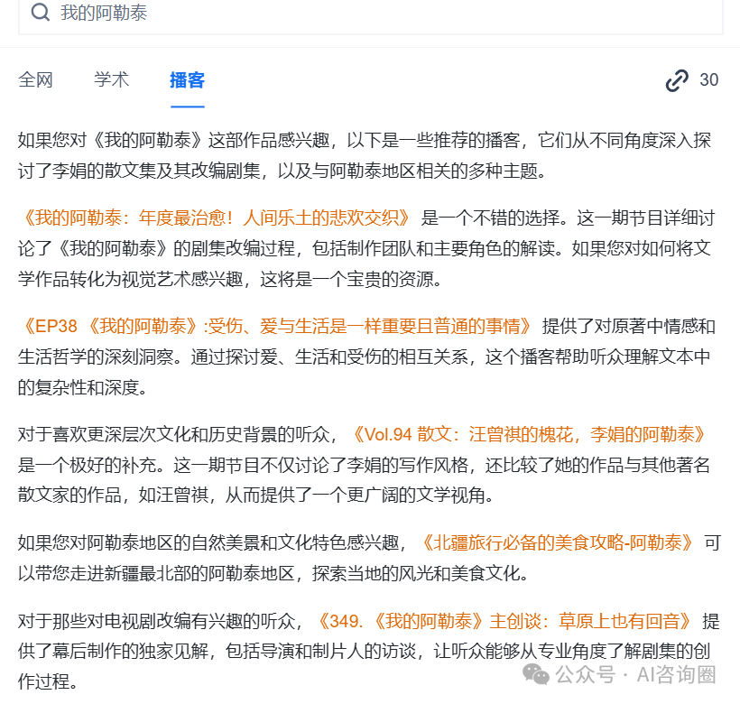 借助秘塔AI播客搜索,秒读了30个《我的阿勒泰》有关的播客音频,并进行了智能整理。