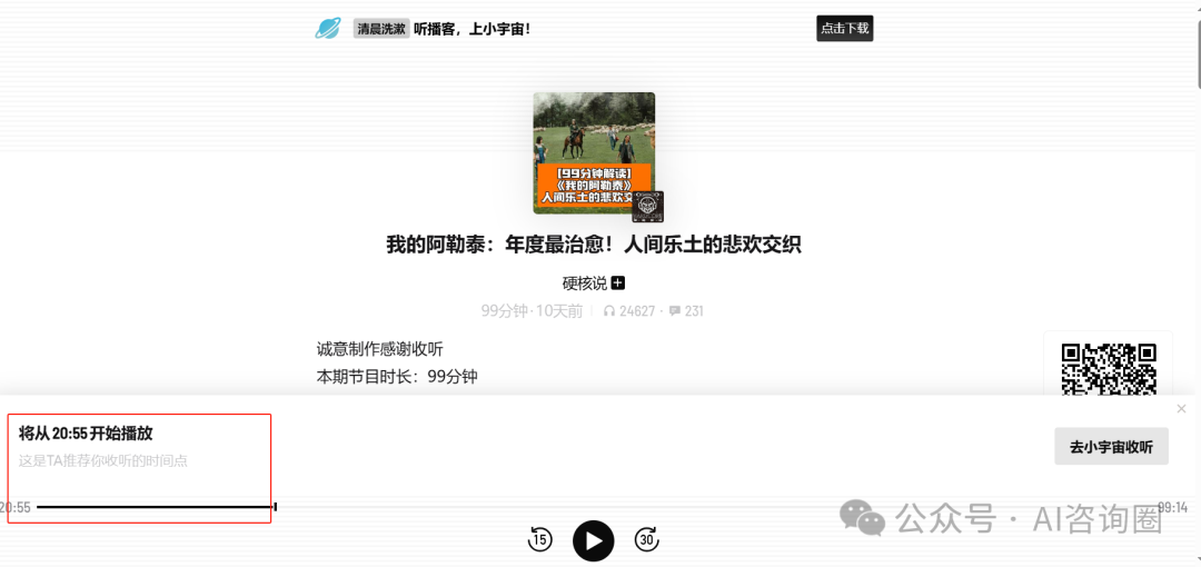 鼠标放在时间轴上,可以点击直接跳转到播客的这个时间节点点击播放收听。