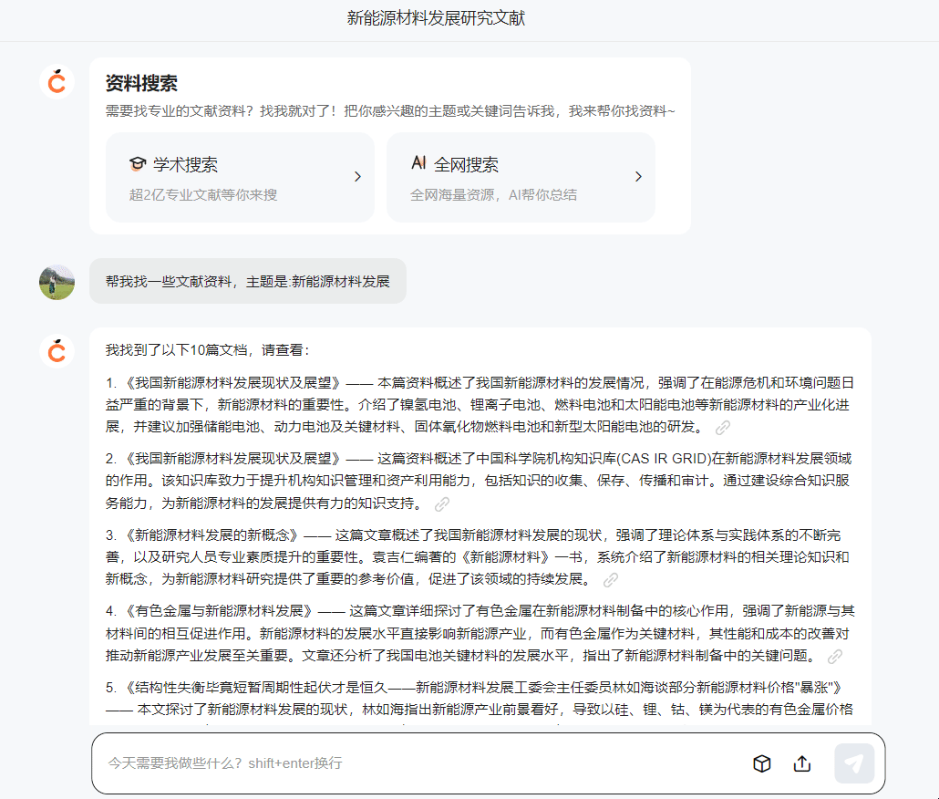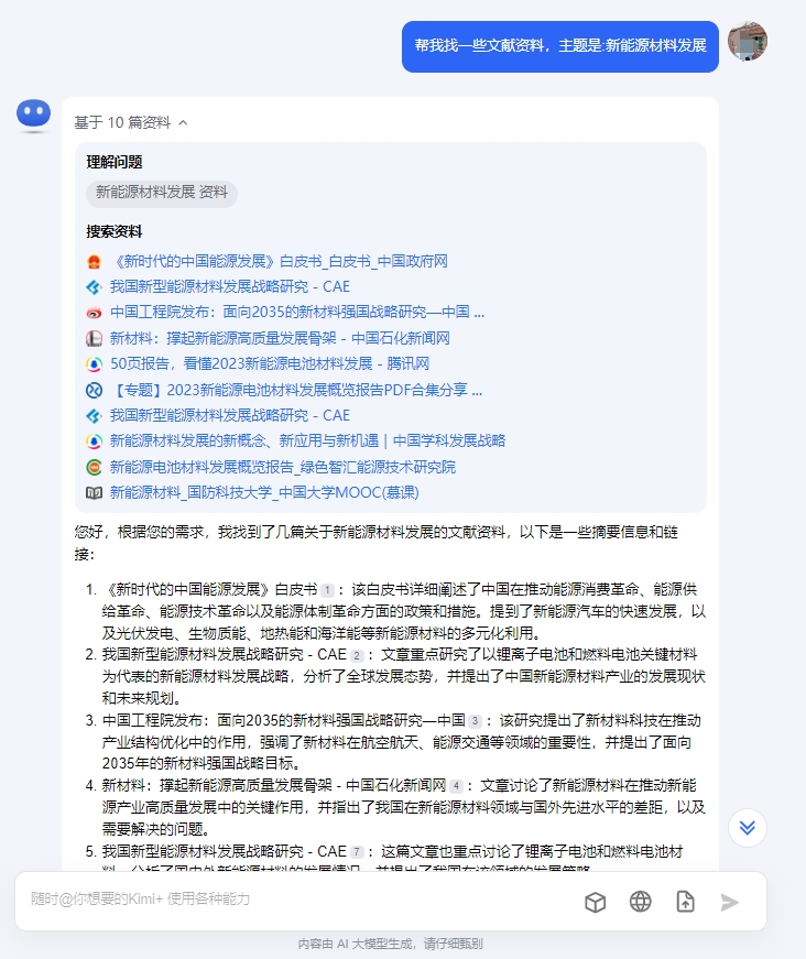 我们接着看kimi的表现如何,在对话框输入查找新能源发展的文献指令,同样也能给出摘要信息和链接,可以满足基本的查阅需求,阅读十分方便。不过,从截图可以看出,kimi在只抓取了互联⽹公开内容,无法给出更专业的文献。
