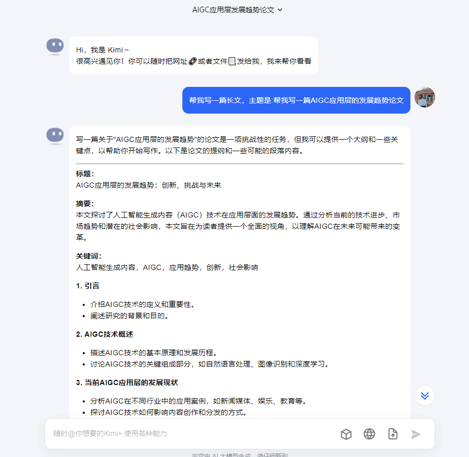 从专业查阅能力来看,橙篇给出的结果显然更为专业,更能符合论文写作、研究报告等更为专业的写作查阅需求。橙篇另一个吸引人的地方是,号称一次生成最多10万字的长文,并且能够根据文档内容和提示词需求进行深度编辑和调整。我们来继续体验下这款工具长文写作功能,首页点击“长文写作”,进入该功能,可选择输入主题生成,或者上传参考文献根据文献生成内容。这里我体验下输入主题生成,比如让它写一篇关于“AIGC应用层的发展趋势论文”系统会先生成长文大纲,不满意的话可以点击直接修改,或者继续生成长文:选择生成长文(提示需要10分钟),点击对话记录中生成的文档,就可以进入生成论文详情页面了。从下图可以看到,橙篇真的直接给你整出一个看起来十分专业的论文文档,包括引言、文献出处都列出来了!同样擅长长文的Kimi,我们也来看看表现如何。输入同样的指令词,这里不在赘述。比较遗憾的是,目前该平台暂时无法生成这么长的论文文档,仅提供大纲内容。如下图所示:Kimi返回的结果是,仅“提供一个详细的论文草稿,包括引言、几个主要章节的详细内容,以及结论。请注意,这只是一个基础的草稿,你需要根据实际研究和数据来进一步发展和完善。”