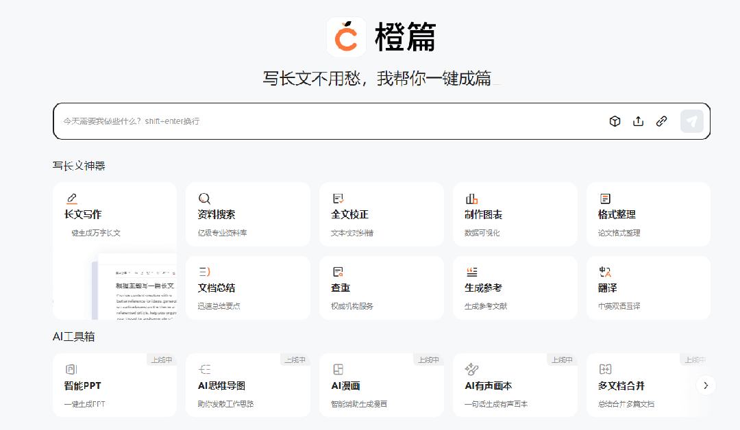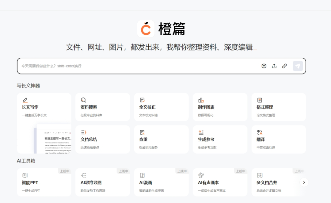 · 界面简洁直观:用户操作便捷,无需复杂学习即可上手。· 专业查阅能力:拥有10亿级专业学术资料库,包含100万国内外学术站点,资料实时更新。· 超长文生成:支持一次生成10万字长文,并可进行深度编辑和调整。· 多模态深度编辑:支持文本、图片、表格等多种格式无缝切换,提升创作灵活性。· 文件上传能力:支持一次性上传100个文件,单个文件最大容量达200MB,兼容多种格式。· 算力支持:依托百度文心大模型,算力充沛,无惧高峰期瓶颈。我们这段时间也深度体验了一把。为了更直观的展示橙篇表现,部分功能体验中与Kimi进行了一番对比。先说结论,“橙篇”整体表现可以说相当优秀,特别是在超长文生成方面十分惊艳,Kimi劲敌来了!打开橙篇,给人的第一感觉是十分清爽,从下图就可以感受到: