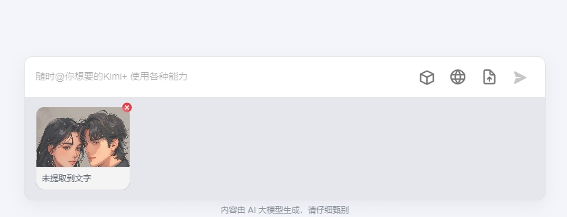而上传同一张图片,kimi会提示未提取到文字,也就是无文字的图片kimi是无法识别解读的。