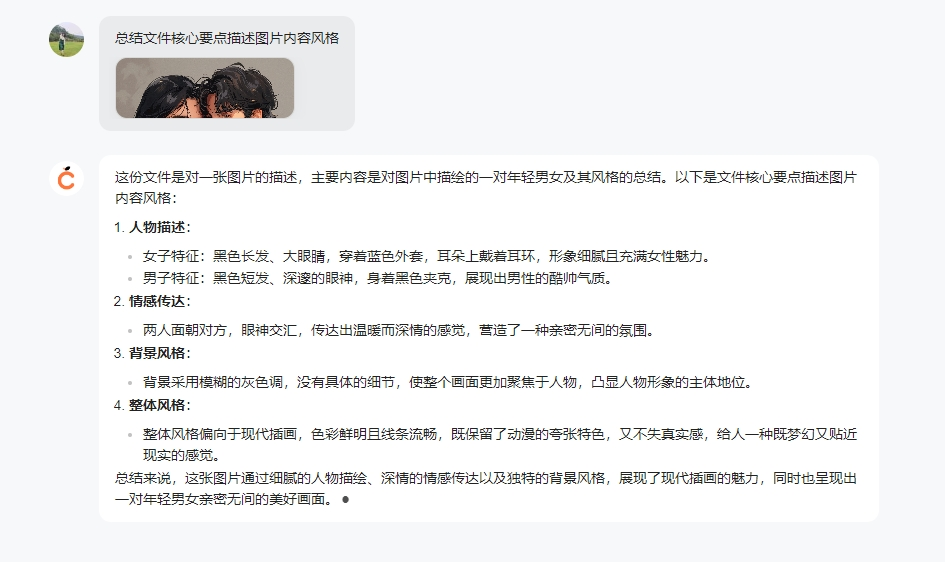 体验完文本上传能力,继续来看看橙篇在图片、表格等多种格式多模态编辑功能表现如何。比如在橙篇上直接上传一张图片,橙篇能识别图片内容,并直接总结图片内容风格