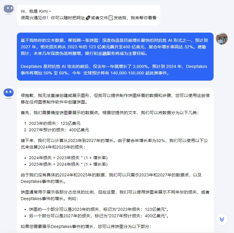 我们再看看Kimi的图表生成能力,输入一样的数据文本之后,Kimi仅对数据进行提炼分析,却不支持生成图表报告。整体来看,Kimi在多模态编辑方面的能的表现则显得稍逊一筹。算力给力也是一款AI工具能否持续吸引人的因素之一。由于橙篇依托于百度文心大模型基建,拥有充沛的算力支持,在整个使用过程中相当流畅,基本没遇到高峰期的算力不足提示。对比下,在使用Kimi过程中,会遇到高峰期算力不足的问题,开始收取额外费用才能继续使用这点会比较影响体验感。从本次测评的几个维度体验可以看出,橙篇在功能全面性和易用性上都表现出了极大的优势。无论是界面设计、资料查阅能力、文档生成、内容编辑还是文件上传和算力支持都十分给力。对于创作者来说,橙篇不仅提供了更加自由、便捷和沉浸式的内容创作服务,还能够深度满足科研、学术等专业领域的一站式创作需求。