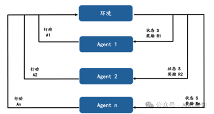多智能体系统涉及更复杂的互动,其中每个智能体的决策不仅受自己的行为影响,还受到系统中其他智能体行为的影响。在这种系统中,至少有两个智能体相互作用,它们可能处于合作或竞争的关系之中。这种模型被称为马尔科夫博弈,其中状态转移符合马尔可夫性质,而智能体之间的关系符合博弈论的原则。