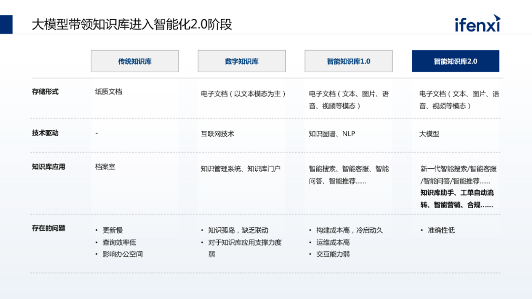 传统 AI 的知识库的话,覆盖的模态基本已经比较多了,文本、图片、语音、视频这些模态都会有。它的核心应用基本上是以搜索、客服和推荐这三个为核心去展开的。相对来说知识库的应用范围比较窄。另外传统知识库 1.0 阶段有三个核心的问题,一直比较难解决。第一个在知识库构建的过程当中成本是比较高的。传统的 AI 知识库相对来说冷启动周期会比较久。要做大量的数据标注,包括知识的提取、流程画布的设计,冷启动中需要话术师,然后包括一部分人工的数据标注,这个时间周期会比较久。第二个 AI 知识库很难做全公司统一的知识库。更多的就是客服,有客服的知识库,整个公司有一个大的知识库门户,但底层的知识库其实还是割裂的,这里边就涉及到运维的成本,一旦要新建一个知识库,还得从 0 再起一套。例如面对 IT 部门,重新去建 IT 的知识库,先要把它抽出来变成一个 IT 的知识库,然后再去做上层的 IT 知识库的搜索检索,所以知识库一旦要做上层的助手时,就需要重建一次,这个运维和更新的成本会比较高。第三个是交互能力比较弱。基本都是封闭域的问答,很难跨域去解决问题,包括交互的上下文的联系能力会比较弱。到了大模型加知识库的阶段,从模态的角度来讲,基本上变化不大,还是过去的文本、图片、语音和视频。第一个核心比较大的变化就是知识库上层长的应用比原来多了很多。除了搜索推荐和客服以外,像知识库的助手、营销、合规、工单自动流转、基于 PDC 的闭环去 tracing 工单,都是过去知识库比较难去做到的,是大模型新增的一个能力点。涉及到交互的一些结果,传统的知识库其实是用全文检索也可以去实现,但是更多的是告诉你检索的位置,包括检索出来的一些结果,但是并没法直接回答你的问题,大模型加知识库,更多的还是用向量去解决问题,所以它能够联系上下文,除了给你结果所在的溯源位置以外,它还能告诉你直接加工出来一些答案,使用更高效。第二个是构建和运维的效率会比原来更高,过去知识库需要有话术师,有人工去做标注。现在构建的环节基本上就变成了文档的上传,上传之后,要去做一些相似问的扩充,这些工作其实并没有省掉。不过在这个过程当中,大模型能够加入其中,在上传一个文档后,大模型能够自动帮你去生成一些问答,人更多的是从中去选择和审核。相似问过去是基于专家经验在做,现在大模型可以帮你去做,做完了之后人更多的是一个审核的一个过程。在构建的过程当中效率比较高,不再需要大量的人工,冷启动周期会比过去要短。在运维的阶段,过去的运维因为底层的知识库有割裂,包括每个知识库的主题方向上,如果要去新建和更新的话,都需要重新去做标注,有可能涉及到话术师的一些配置。现在可以做个统一的全企业的知识库,当然还是要把知识库去做分域,但这个过程当中,人的参与度,包括运维的成本要比原来低很多,即使要做一个新的知识库助手,更多的是调优的过程,而不是从 0 再去搭建一个新模型的过程。第三个是应用场景扩充,核心就是能够覆盖企业内部各个岗位,每个岗位都可以有自己的助手。应用场景的扩充,包括企业用户数量的扩充,是它核心的第三个优势。除了发展历程上的对比,从知识库本身构建和运维的环节角度,也可以看到一些大模型的核心价值。