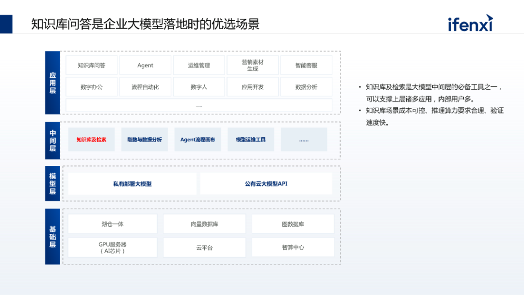 过去大家是把知识库当成核心落地的一个场景,尤其今年爱分析和企业用户交流的过程中,企业用户基于上层的场景,抽象出一些中间的能力,放在中间层。过去的中间层主要是一些大模型的运维工具,现在有越来越多的企业用户会考虑把中间层作为一个能力中台,去调用各种各样能力。第一个是知识库及知识库的 RAG 检索,是企业用户在落地的过程中,优先考虑以及选择比较多的能力场景。第二个是大模型加数据分析,不管是对话式数据分析,还是直接取数,这是第二个中间的能力场景。第三个是 Agent 的一个流程画布,是因为大模型涉及到有 Agent 能力做目标的理解、任务的拆解和自动执行,所以这是第三个核心能力场景。基于这三个核心的能力场景,延伸出企业用户在落地应用时,会优选的一些核心落地方向。知识库和检索毫无疑问是第一位的,因为在实际落地的过程中,大家最开始接触的 langchain 或者是 FAST GPT ,这些其实都是基于知识库落地的。今年落地时大家很关心的 RAG ,其实也是知识库上层检索落地的一些应用场景。第一个核心点从大模型的能力角度来讲,它会逐渐越来越偏中间层。知识库问答是知识及检索之上的一个应用场景,知识库和检索作为中间的能力层,可以应用的点会很多。这也是为什么我们建议企业用户优选知识库问答落地的原因。第二个核心点是知识库及检索带来的上层应用比原来多了很多。过去大家理解知识库主要核心就两个场景,一方面是有一个知识库的门户,是公司内部在使用。另一方面是知识库上层做客服,除了这两个场景以外,其他的场景跟知识库之间的关系会小很多。但是现在知识库及检索如果变成一个能力的话,对内部用户和可应用的场景范围变大了,因为不光是客服可以有助手或者客服底层有知识库,其实 it 、营销、HR 也可以有。包括现在央国企落得比较多的办公类场景,其实很多时候都在落各种各样的一些 SSC 的场景,这背后其实都是知识库问答,或者说知识库其实是核心落地的基础。第三个核心点从知识库本身的建设的过程当中,我们总结下来就是三个核心的要素:成本可控、算力、验证速度。首先是知识库场景的成本可控,不管是去年下半年也好,还是今年上半年也好,知识库实际落地的时候,它的成本相比较其他大模型的落地场景预算,相对来说比较便宜。也可以去做公有云的一些调用,这样如果用 API ,价格会比较便宜。整体知识库的场景建设,成本基本上是能控制在百万级别。其次即使私有化部署,用的模型参数量要求也不会特别多,大部分我们看到的基本上都是十几 B ,30B+的看到的比较少,绝大部分 100 亿左右参数就能解决。推理的算力相对来说要求会比较低,如果你有一块英伟达的卡,基本上 10 - 20 个并发的知识库问答,基本上一张卡推理就能解决。有时候也能看到很多提供的解决方案里,也是带了一体机,基本上就是百万级别的一体机能解决实际的场景落地,这是推理算力要求比较低的优势点。同时整个知识库场景上层的建设成本也会低很多,因为它主要的应用是把它包装成 API 嵌到应用里边,另外一就是直接做知识库的问答展现在前台,所以它的场景搭建成本会稍微低一些。最后落地的速度比较快,验证起来也比较快,绝大部分知识库的问答场景可能是在一个季度之内就能解决。对比私有化部署需要花半年甚至一年左右的时间去验证的话,这个验证的速度是比较快。到底大模型加知识库和传统的知识库有哪些区别?