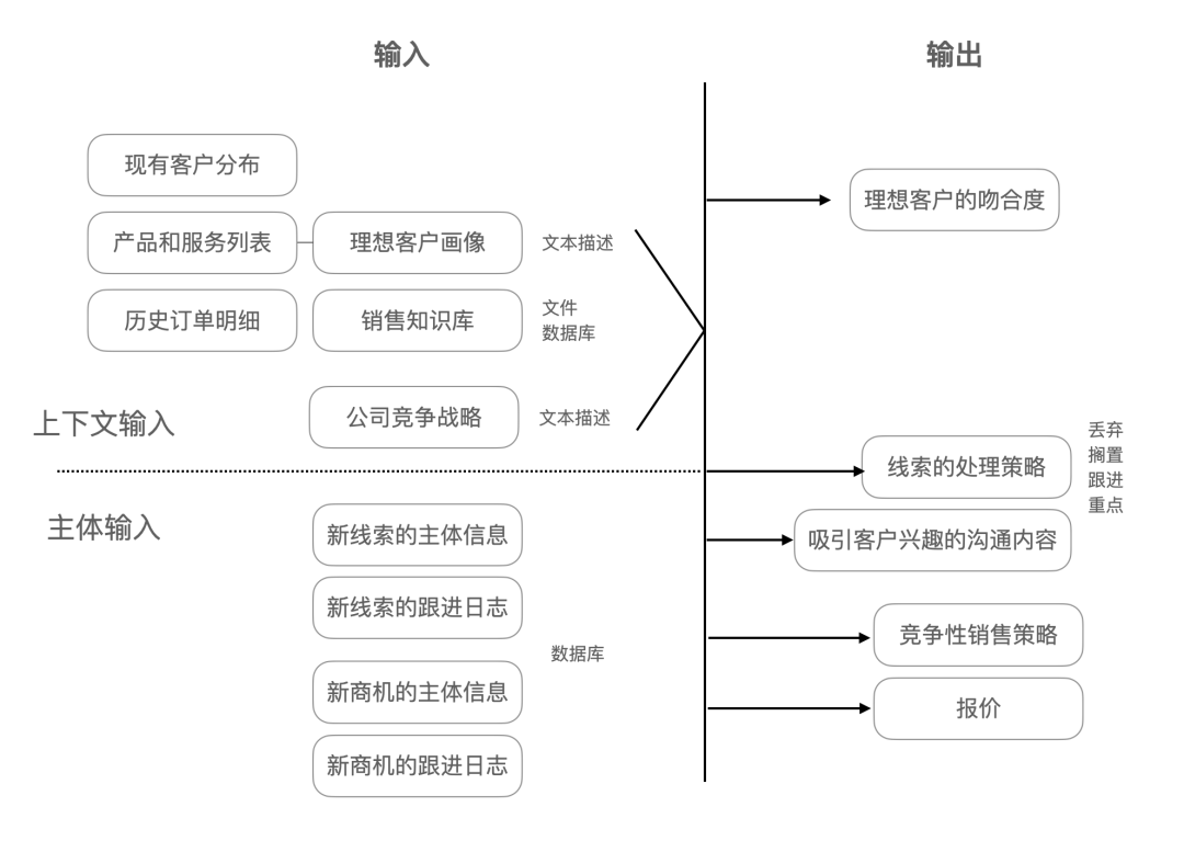 销售策略分析和建议毫无疑问是作用于企业的核心业务流程——把产品服务卖出去。为了解决这个问题,AI 应用设计者应该充分了解并且能够抽象相关业务环节的诸多要素。决定一个有效的销售行动建议绝对不是一个简单的提示词对话框所能够涵盖的。根据下面我画的示意图,它至少涉及上下文相关的输入参数,包括理想客户画像描述,不断扩充的销售知识库(包括公司,产品,方案,方法论等诸多细节内容),以及公司当下的竞争战略描述。同时,为了给每一个销售对象提供不同时机的销售建议,还需要获取在销售漏斗中的线索和商机的相关信息。AI 的输出也要结合业务环节提供具体的产出物。在新线索阶段可能是理想客户吻合度的一个量化结果,也可能是对线索跟进的行为建议,同时包含在线索阶段为激发客户兴趣所生成的针对性沟通内容,在商机阶段能够给出明确的竞争性销售策略以及生成报价文档。