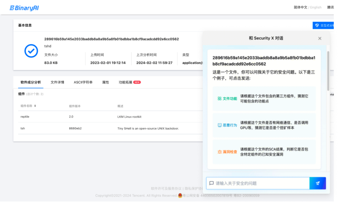 除了可以作为独立的应用,还可以作为组件被第三方安全站点集成,如下所示,例如我们将其集成到BinaryAI中,可以分析文件的功能、第三方组件、文件行为以及可能的漏洞等信息。未来我们会发布威胁情报研判Agent的技术文章,并且开放威胁情报研判Agent的能力,敬请关注。