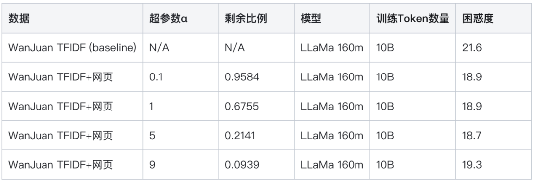 表格中数据括号表示该数据源与其他数据源的比例,整体数据都已去重。从实验中得到的结论是:- 适当地提高高质量数据权重可以进一步降低困惑度,但是需要注意不能重复太多次,否则会产生过拟合