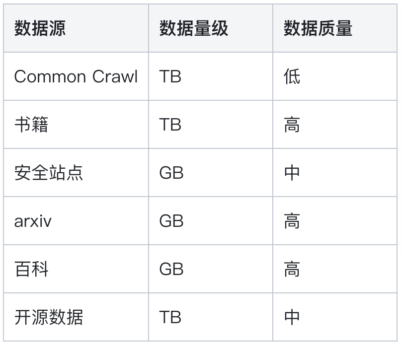 - Common Crawl 等网页数据,含有大量的文本数据,但是数据质量一般,需要进行详细的数据清洗和领域数据筛选,见网页数据清洗流程