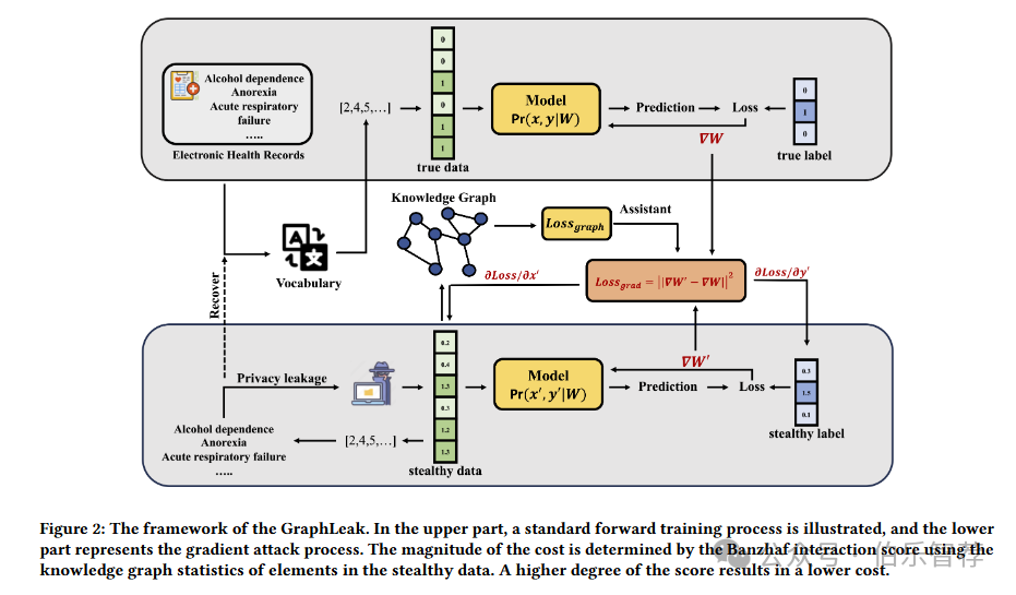 GraphLeak 的框架。在上半部分,说明了标准的前向训练过程,下半部分表示梯度攻击过程。成本的大小由 Banzhaf 交互分数决定,使用隐蔽数据中元素的知识图统计。分数越高,成本越低。3 实验